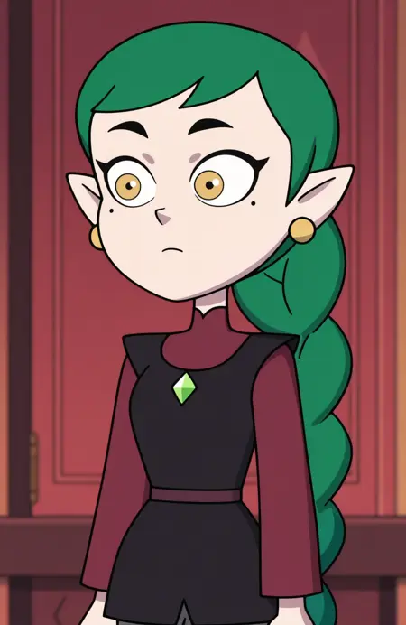 Emira Blight: emira blight, pointy ears, long hair, green hair, yellow eyes, braided ponytail, mole under eye