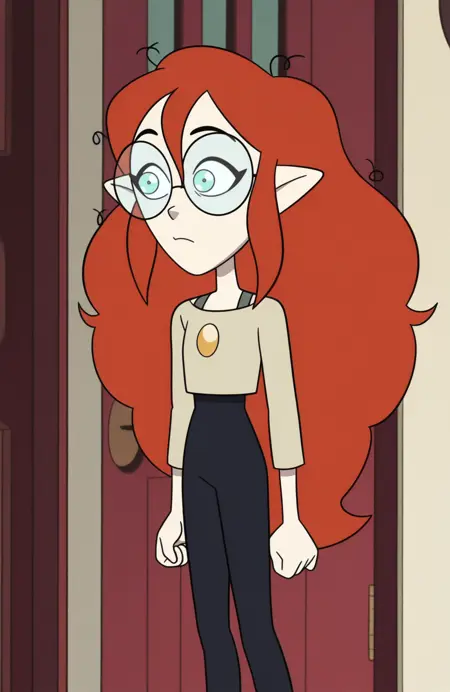 Young Lilith: lilth clawthorne, pointy ears, messy hair, hair between eyes, young lilith, sidelocks, red hair, curly hair, very long hair, aqua eyes, round eyewear