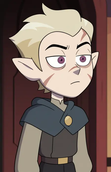 Hunter: hunter \(the owl house\), pointy ears, purple eyes, blonde hair, scar on face,