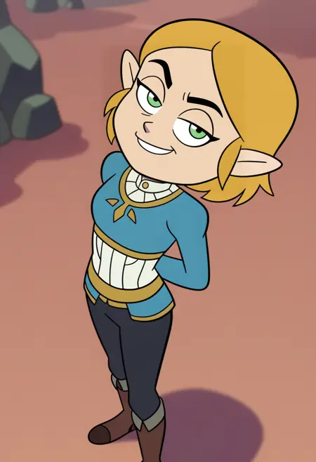 ハンター: hunter \(the owl house\), pointy ears, purple eyes, blonde hair, scar on face,