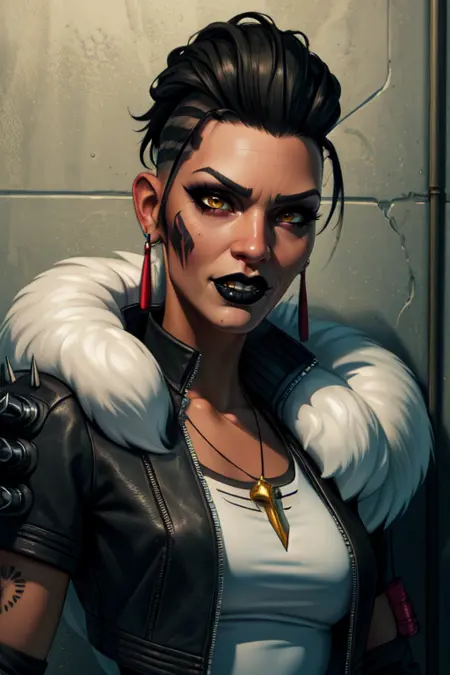 black jacket, fingerless gloves, red earrings, or tassel earrings, fur trim, necklace, white shirt, pants, spiked shoulder pad, bandolier, black boots,
