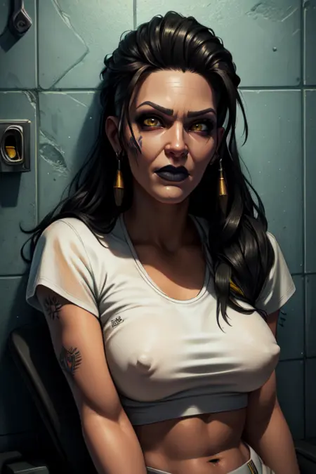 MadMaggie, hair slicked back, black hair, yellow eyes,