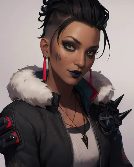黑色夹克、无指手套、红色耳环或流苏耳环、皮毛镶边、项链、白衬衫、裤子、带尖刺肩甲、弹药带、黑色靴子,