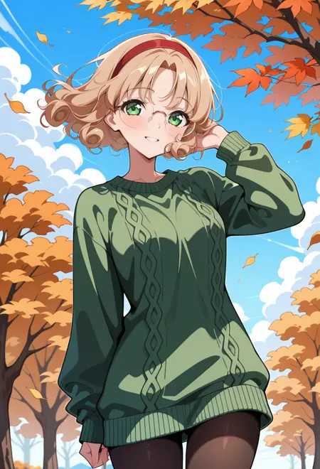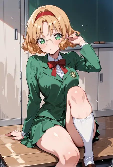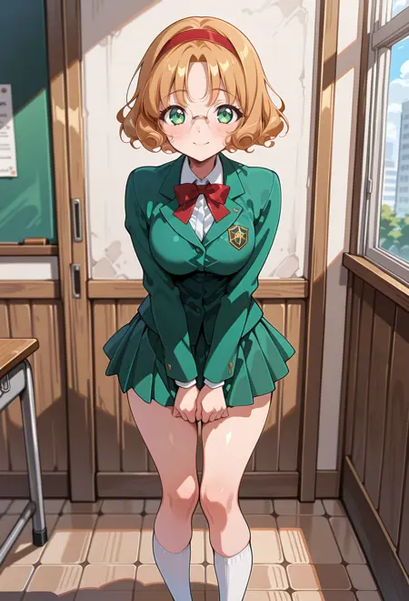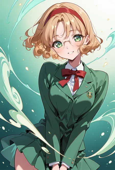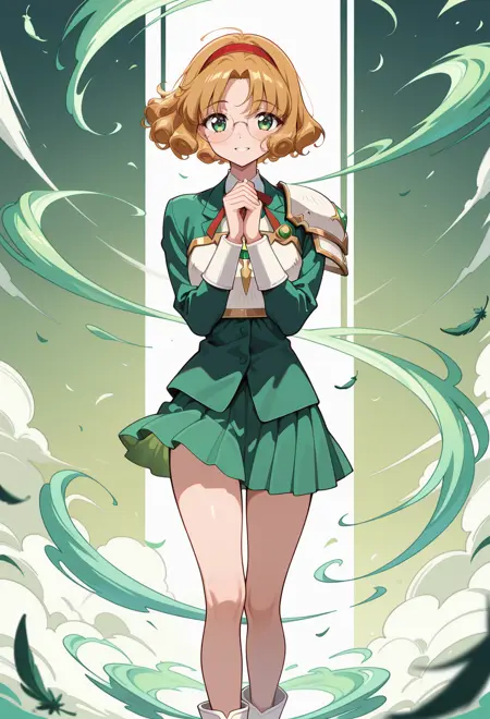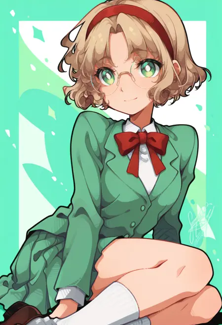AEFuuKnight、緑色の目、薄茶色の髪、カールした髪、分け目のある前髪、短い髪、眼鏡、フレームなしの眼鏡、丸型眼鏡、赤いヘアバンド、胸板、肩甲板、緑色のスカート、ミニスカート、プリーツスカート、踝靴、白い靴、