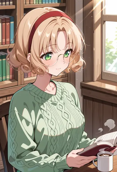 緑色の目、薄茶色の髪、カールした髪、分け目のある前髪、短い髪、眼鏡、フレームなしの眼鏡、丸型眼鏡、赤いヘアバンド、
