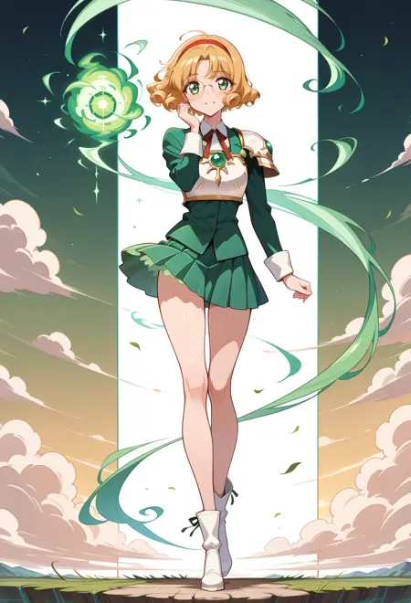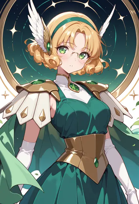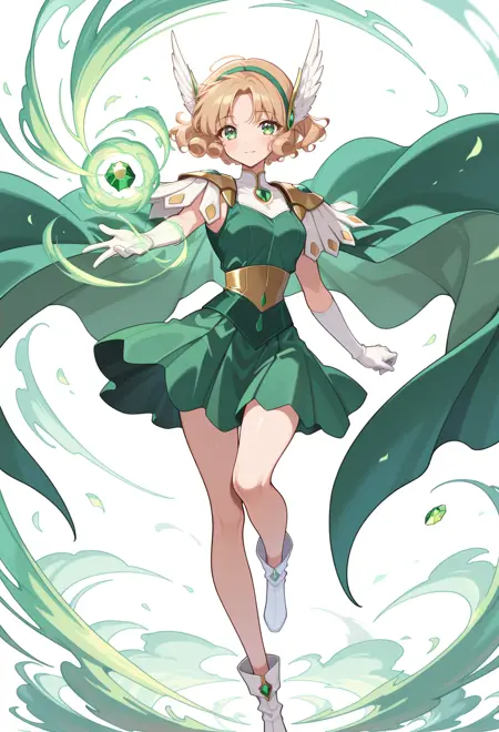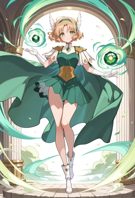 AEFuuFinal、緑色の目、薄茶色の髪、カールした髪、分け目のある前髪、短い髪、緑色のヘアバンド、髪飾り、翼状の髪飾り、鎧のドレス、緑色のマント、肘ガード、宝石、緑色のドレス、緑色の宝石、肩甲板、ノースリーブ、白い手袋、白い靴、