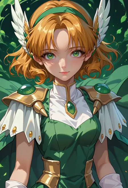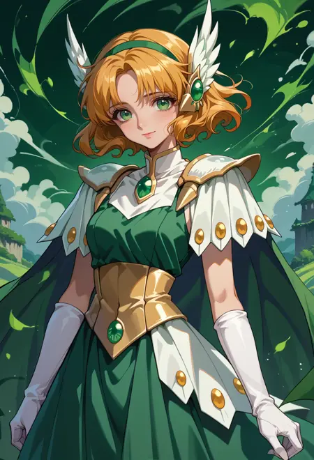 AEFuuFinal,绿色眼睛,浅棕色头发,卷发,中分刘海,短发,绿色发带,发饰,头翼,翅膀形发饰,铠甲连衣裙,绿色斗篷,肘部手套,宝石,绿色连衣裙,绿色宝石,肩甲,无袖,白色手套,白色鞋履,