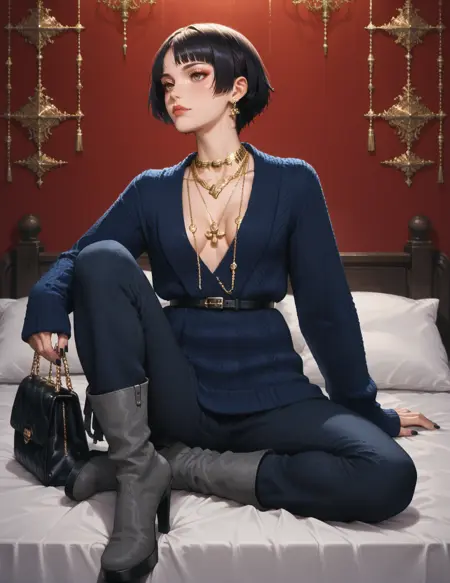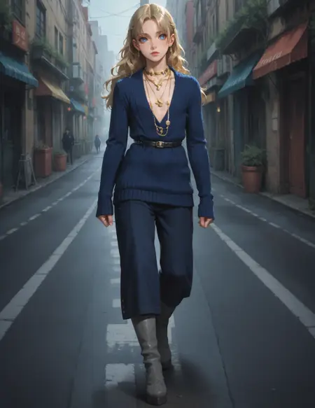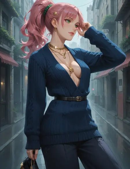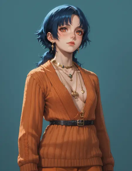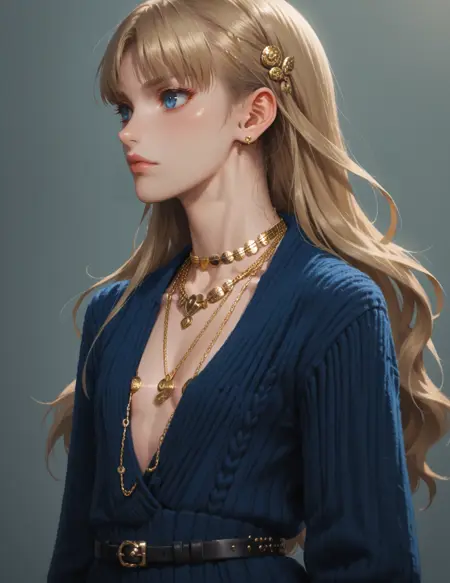 knit, blue sweater, gold jewelry, jewelry, cleavage, belt, pants, necklace, no bra, plunging neckline