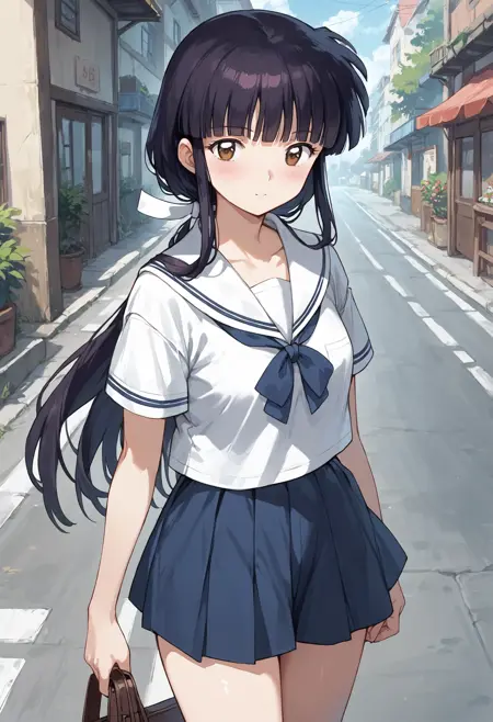 二つの髪型が混同されることがあります。髪を下ろしたの画像を生成する際に、**_"low ponytail"や"hair ribbon"_**をネガティブプロンプトに入れると、もっと安定した結果が出る。