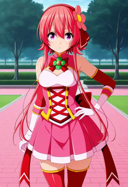 magical girl,pink dress,red elbow gloves,red thighhighs,pink hair ornament,white gloves,boots,