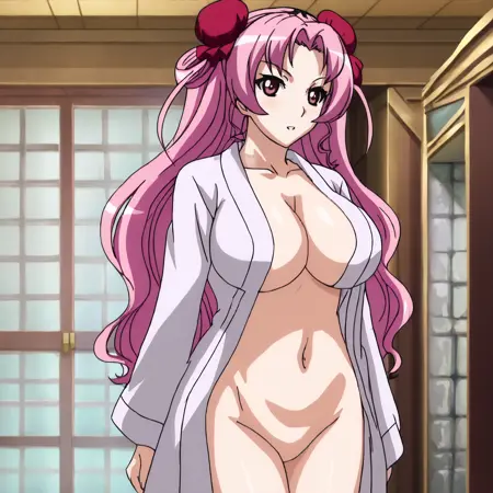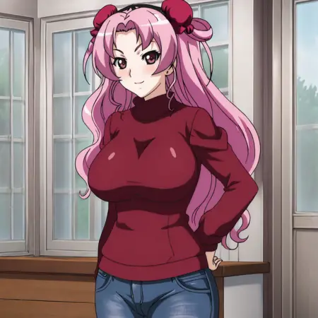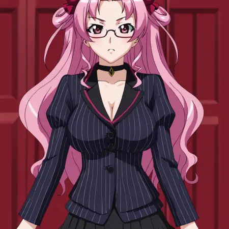 Trigger : Miyuri, 1girl, pink hair, skirt, school uniform, double bun, large breasts, hair bun, necktie, pink eyes, cowboy shot