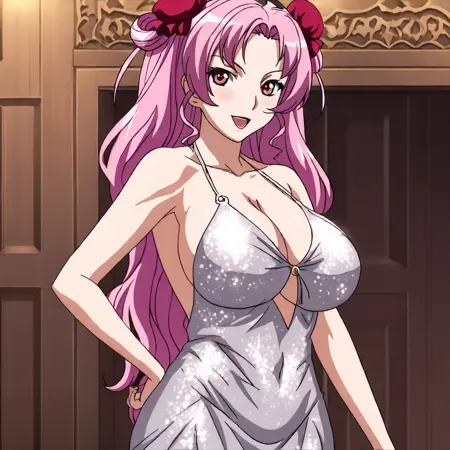 Trigger with princess outfit: MiyuriDress2, 1girl, solo, large breasts, pink hair, cleavage, long hair, gloves, dress, hair flower, necklace, jewelry, bracelet, hair ornament, rose, cowboy shot