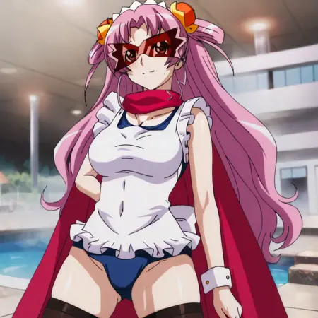 • 不带标志的超级英雄触发词:MiyuriSuperhero1, 1girl, 过膝袜,连体泳衣,长发,围裙,墨镜,斗篷,粉色头发,发髻,学校泳装,双发髻,牛仔镜头