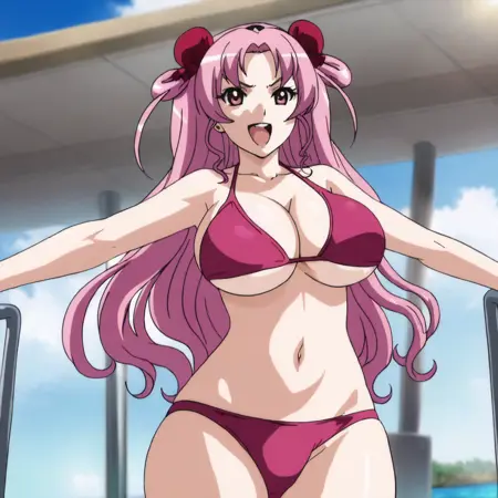 • 比基尼触发词:MiyuriBra, 1girl, 大乳房,泳装,粉色比基尼,粉色头发,发髻,肚脐,双发髻,乳沟,粉色眼睛,下乳,分刘海,锁骨,牛仔镜头
