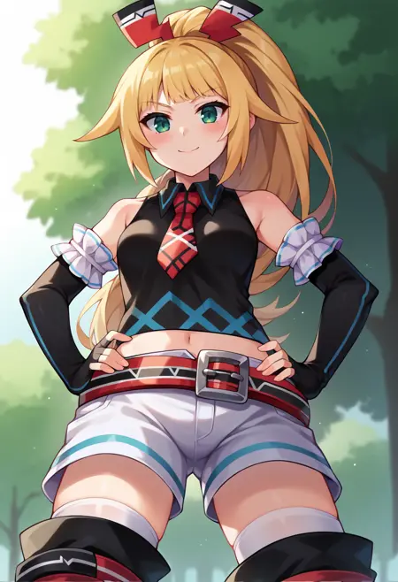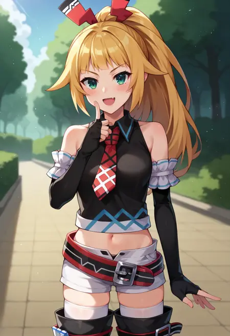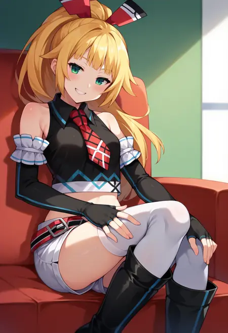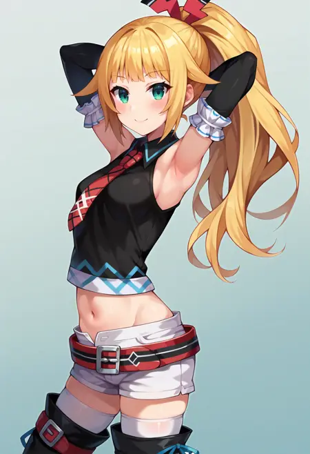 • dengekiko, blonde hair, ponytail, hair ribbon, black crop top, necktie, black gloves, elbow gloves, fingerless gloves, midriff, belt, white shorts, short shorts, white thighhighs, black thigh boots,