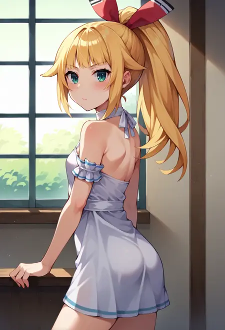 • dengekiko, blonde hair, ponytail, hair ribbon,