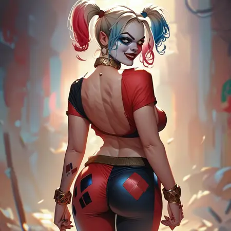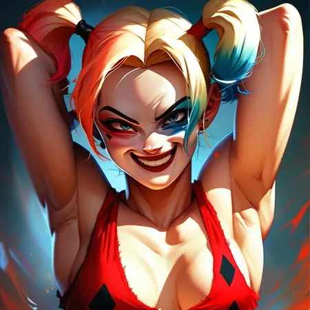 semi-realistic comic book style Harley Quinn would be a chaotic anti-heroine with vibrant, exaggerated expressions, wielding oversized weapons. She’d blend her quirky humor and acrobatics with intense battles, often clashing with both heroes and villains in a fantastical world.