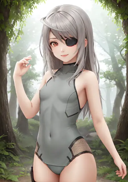 회색 레오타드, 비행사 복장, 하프넥, 어깨 노출, 배꼽 커버, 회색 무릎까지 오는 양말