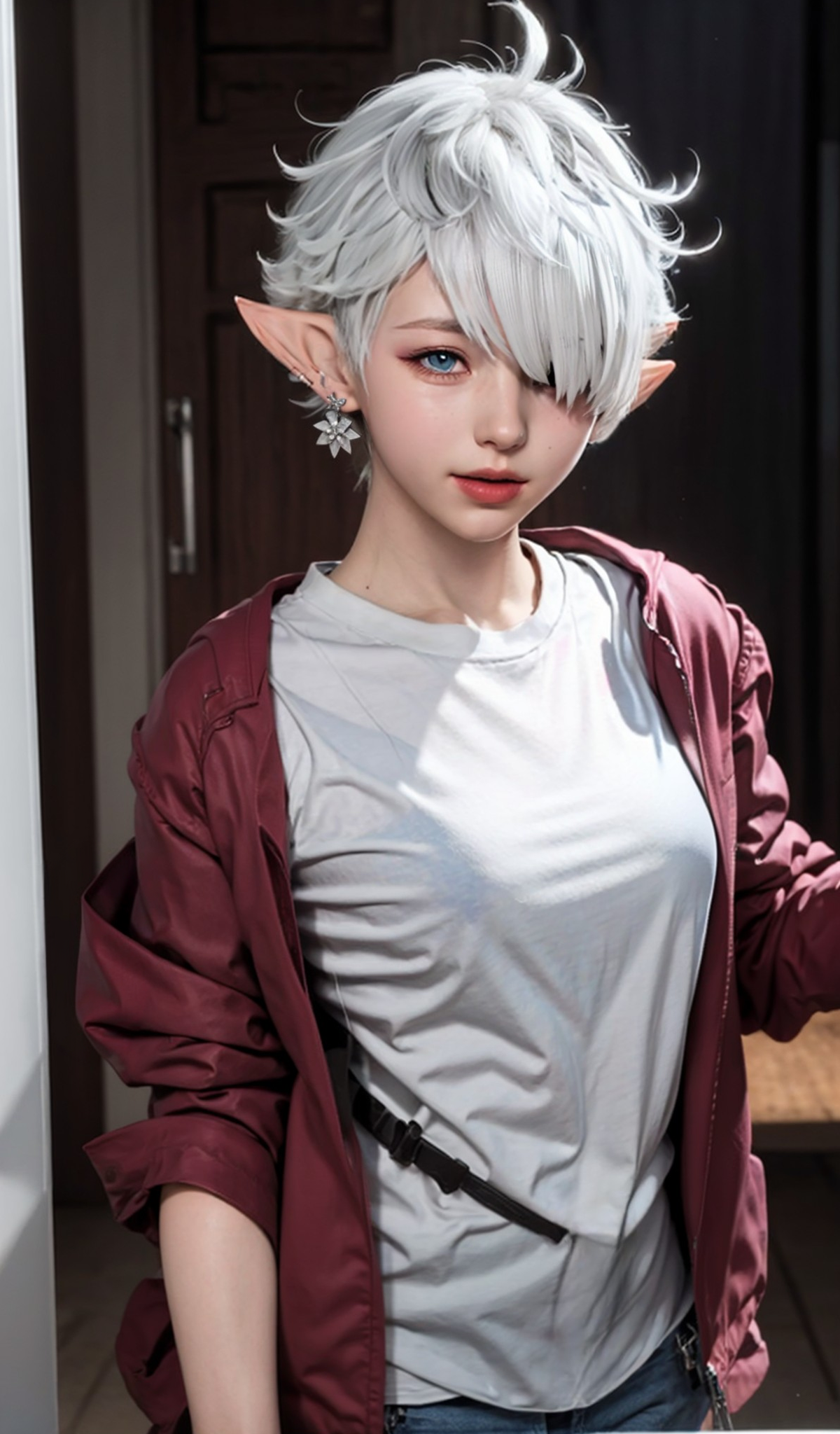 标签:白色头发,蓝色眼睛,红色夹克,尖耳朵