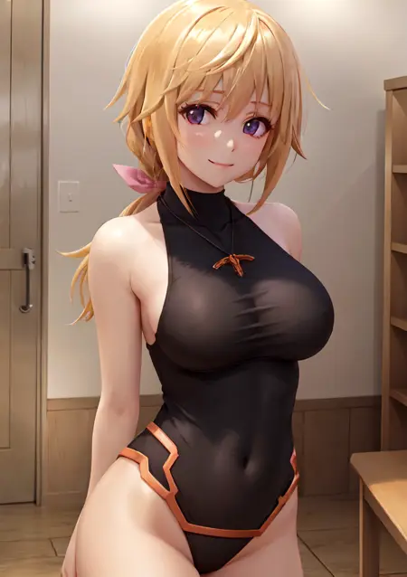 블랙 레오타드, 조종사 유니폼, 복부를 가린 디자인, 블랙 레그웨어, 어깨 노출, 하라넥