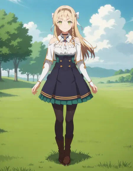 克劳迪娅蓝色连衣裙装扮 | 金发、乳房、绿眼、辫子、发髻、蓝色连衣裙、肩上长发、发结
