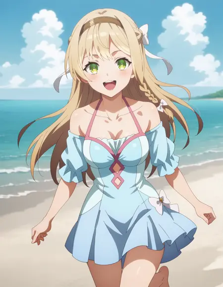克劳迪娅泳装装扮 | 金发、乳房、绿眼、辫子、长发、白色蝴蝶结、泳装、发带、露肩、连衣裙