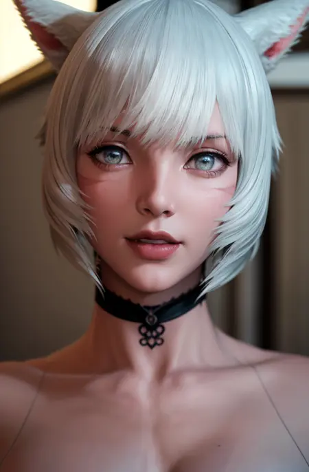 태그: miqo'te, short_hair, cat_ears, white_hair, grey eyes/green eyes