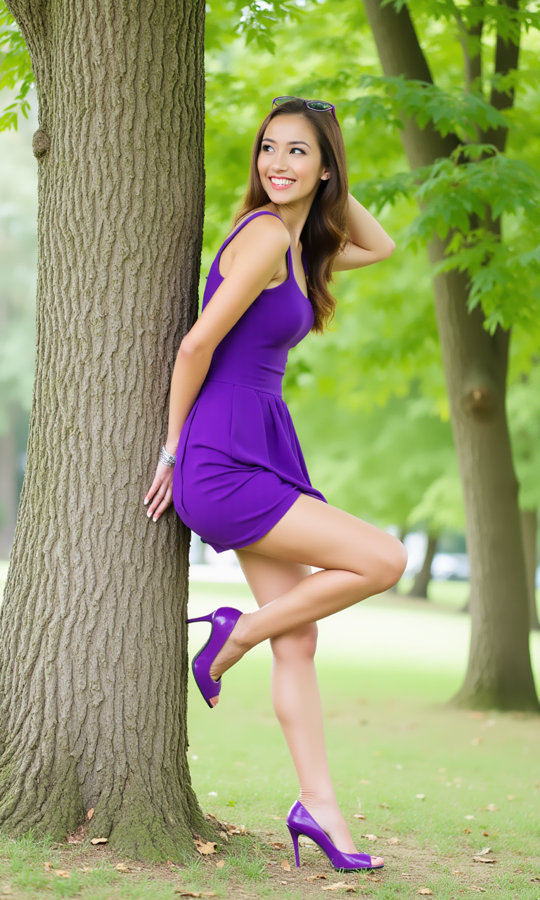 swfaw, <front view|side view>, (スリムな25歳の女の子) が赤いトップスと短い黄色のスカート、ハイヒールを履いて、公園の木に背中を預けて寄りかかっている