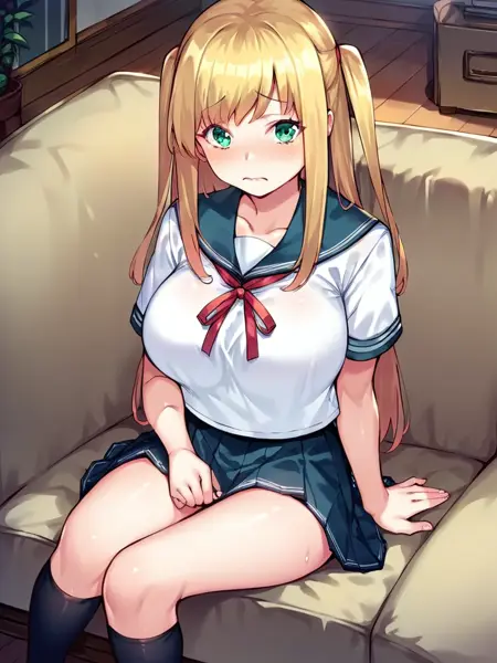 이리스: iris sk, 긴 머리, 금발, 녹색 눈, 양쪽 올려매기, 중간 크기 가슴,
