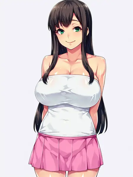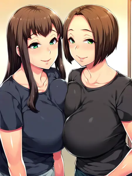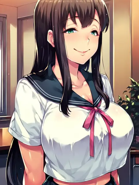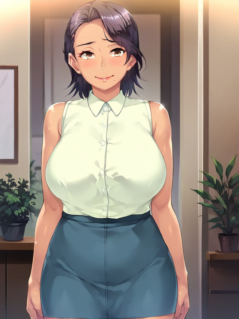 - 츠카모도 미사코: tsukamodo misako, 성숙한 여성, 갈색 눈, 검은색 머리, 중간 길이 머리, 비대칭 앞머리, 큰 가슴,