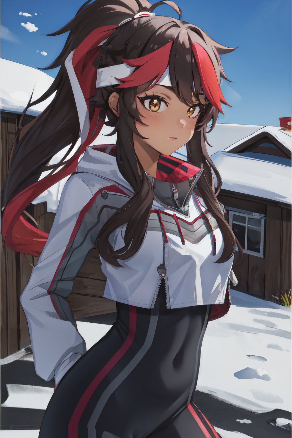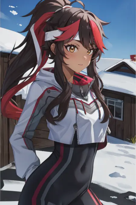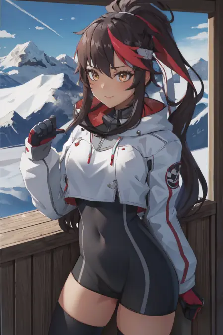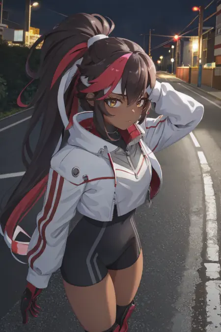 긍정적: 마스터피스, 최고 품질, 1녀, lora:juliette-08:0.8, 줄리엣, 펜더테일, 자르인 재킷, 블랙 브래지어, 아래 가슴
