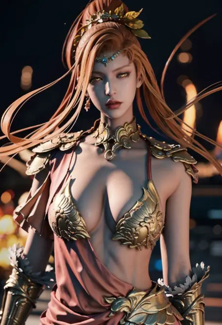TAG:黄色い目、オレンジ色の髪、ジュエリー、アーマー、レッドドレス、ビキニアーマー