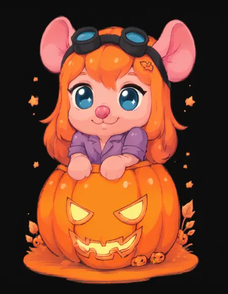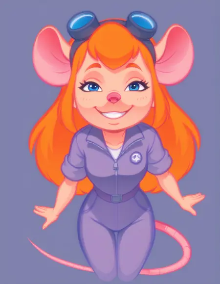 提示词: 小工具,粉红色皮肤,橙色长发,紫色连体衣,蓝色眼睛,鼠尾,短袖,头戴航空护目镜。