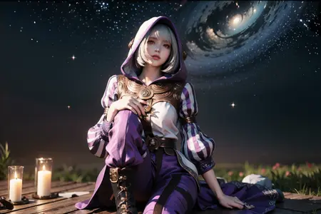 可添加标签:striped、hood、hooded_cloak、long_sleeves、jewelry,以获得她游戏内的服装造型。