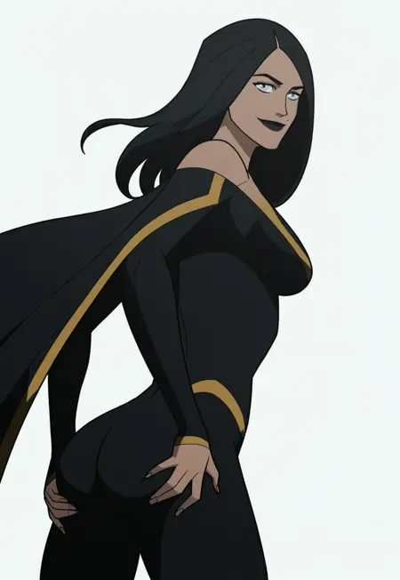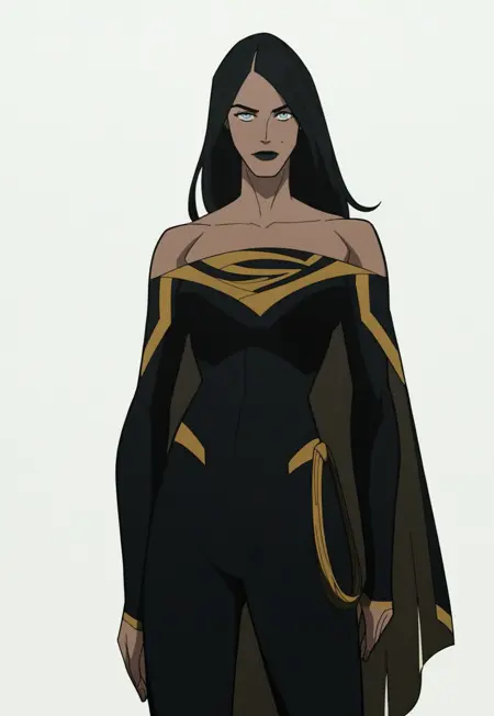 bare shoulders, cape, black bodysuit, golden trim, boots, high heels