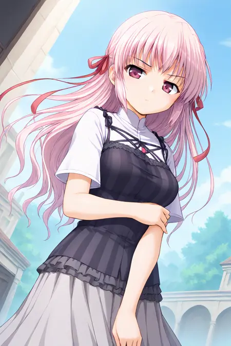 estel freesia, purple eyes, pink hair, long hair, sidelocks, half updo, two side up, hair ribbon, red ribbon,
