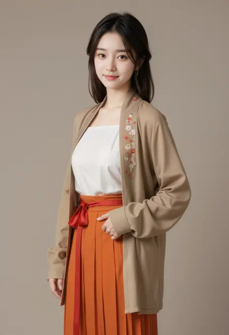 以上提示词代表:带有红色边缘的简洁的白色上衣,渐变红色的袖子,带有图案的红色和橙色的裙子,白色系带