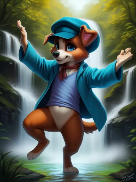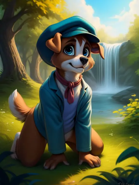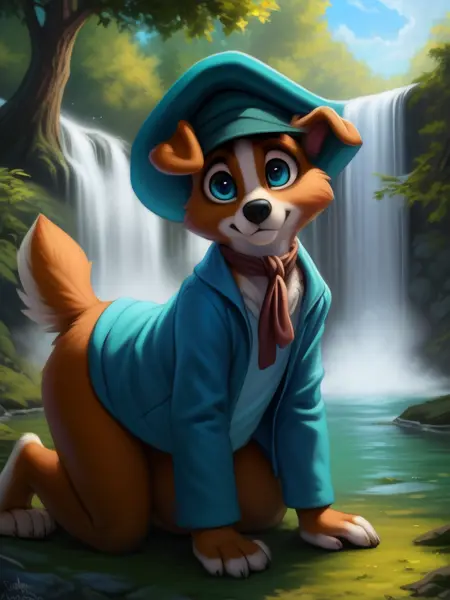 OliverTwistDog, Dog, brown fur,Blue eyes, small red scarf, dark green hat, turquoise jacket, light purple t-shirt, tail, chibi, small body,