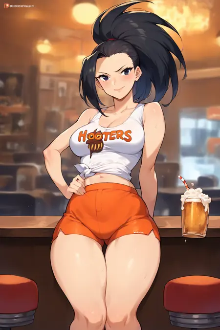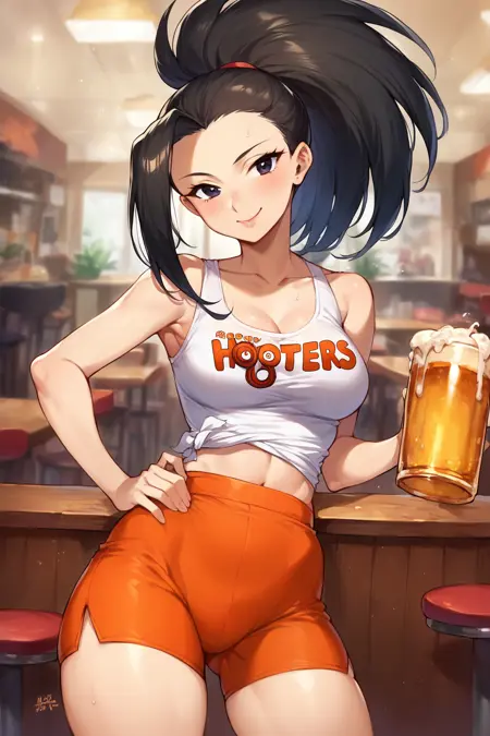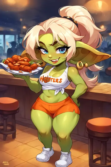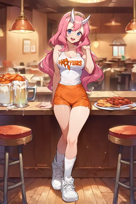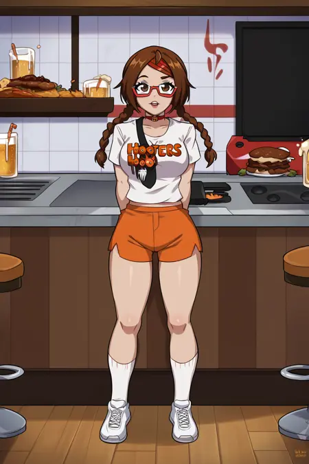 Prompts: hooters logo, short shorts, orange shorts, booty shorts, breasts, owl logo,