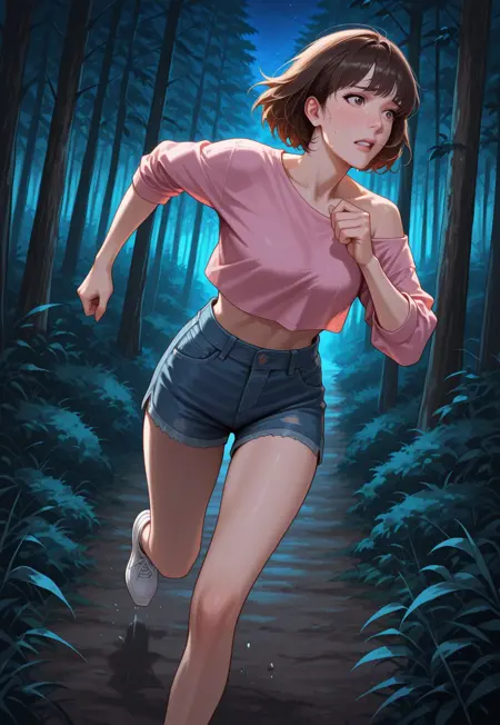 * ピンクのショートトップ、片肩出し、お腹出し、デニムショートパンツ