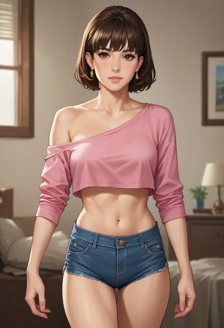 - pink crop top, off shoulder, midriff, denim shorts,