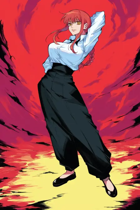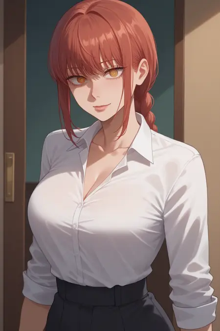 Prompts: Makima, red hair, yellow eyes, braided ponytail, white shirt, large breasts, rings in eyes, narrow waist, makima (chainsaw man), ringed eyes,