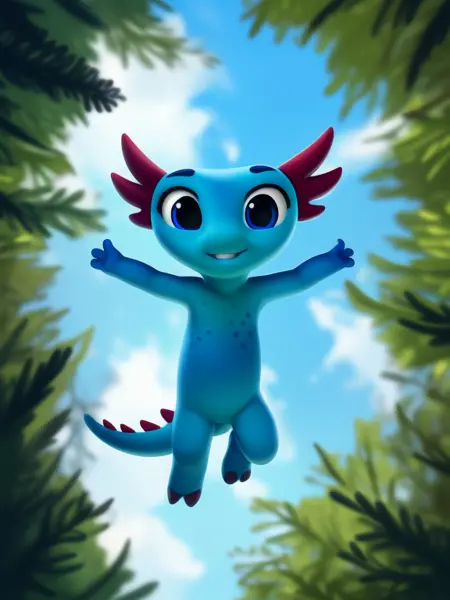 RuRuAxl, Axolotl, blue skin, dark blue eyes, two red toes, tail, chibi, small body, smooth skin, slippery skin, wet skin,wet, damp,sweated,, ( chibi, small body,(wet body, water drops on the body,))