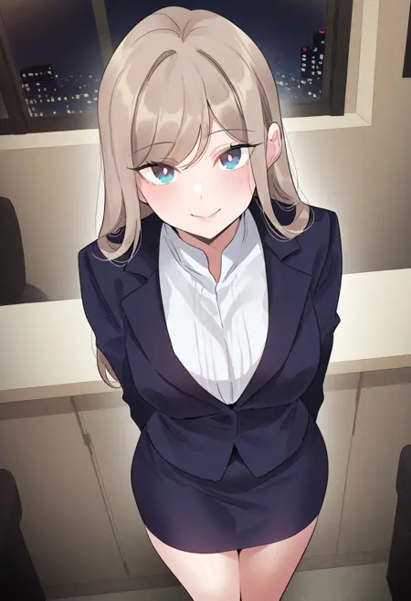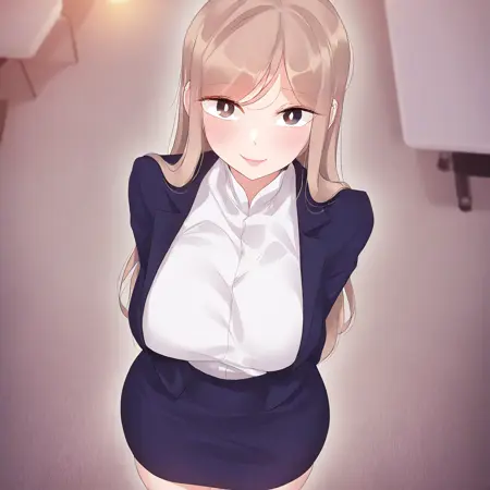 5b. ((正式,高领白色衬衫,性感蓝色铅笔裙,性感白色内裤,)) + 性感白色文胸