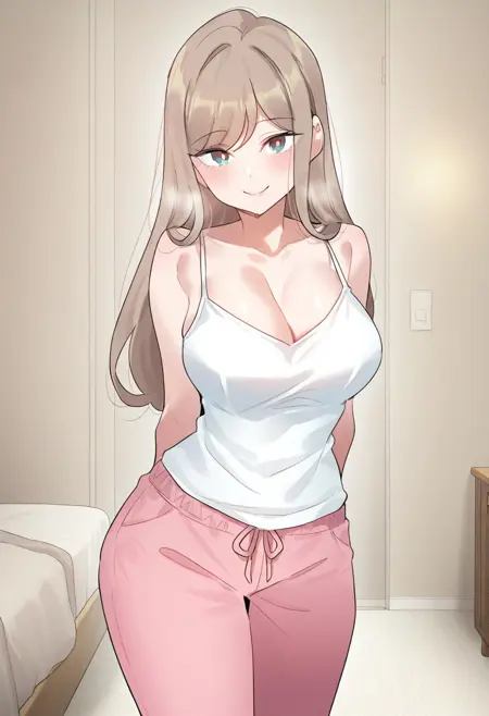((白色背心,露骨胸脯,巨大胸脯,睡裤,)) + 紫色人字拖