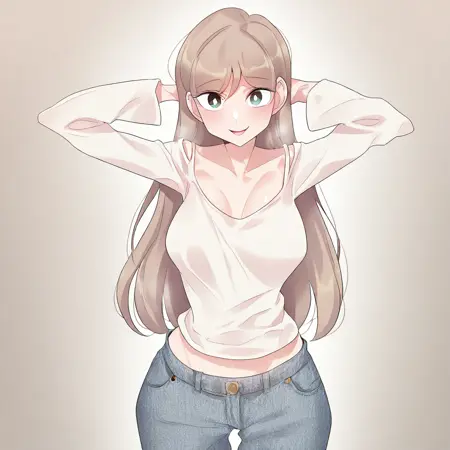 1. ((sexy long-sleeves white top, black top under white top, denim trousers, )) + brown bag with wide shoulder strap