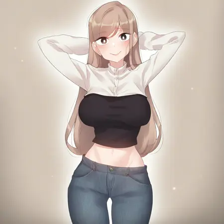 ((粉红色背心,露骨胸脯,巨大胸脯,露脐,长袖白色衬衫,短牛仔裤,黑色棒球帽,))