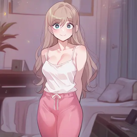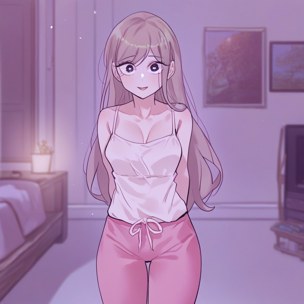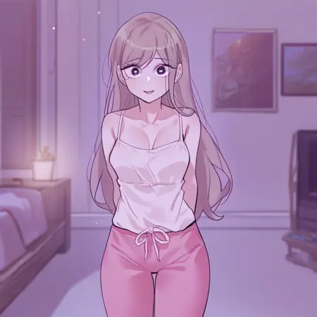 ((白色背心,露骨胸脯,巨大胸脯,睡裤,)) + 紫色人字拖