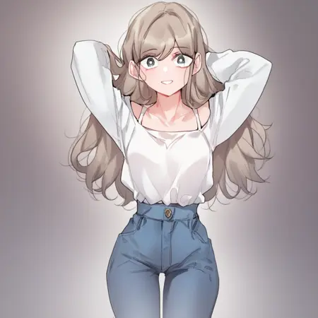 ((性感长袖白色上衣,白色上衣内搭黑色上衣,牛仔裤,)) + 带宽肩带的棕色包