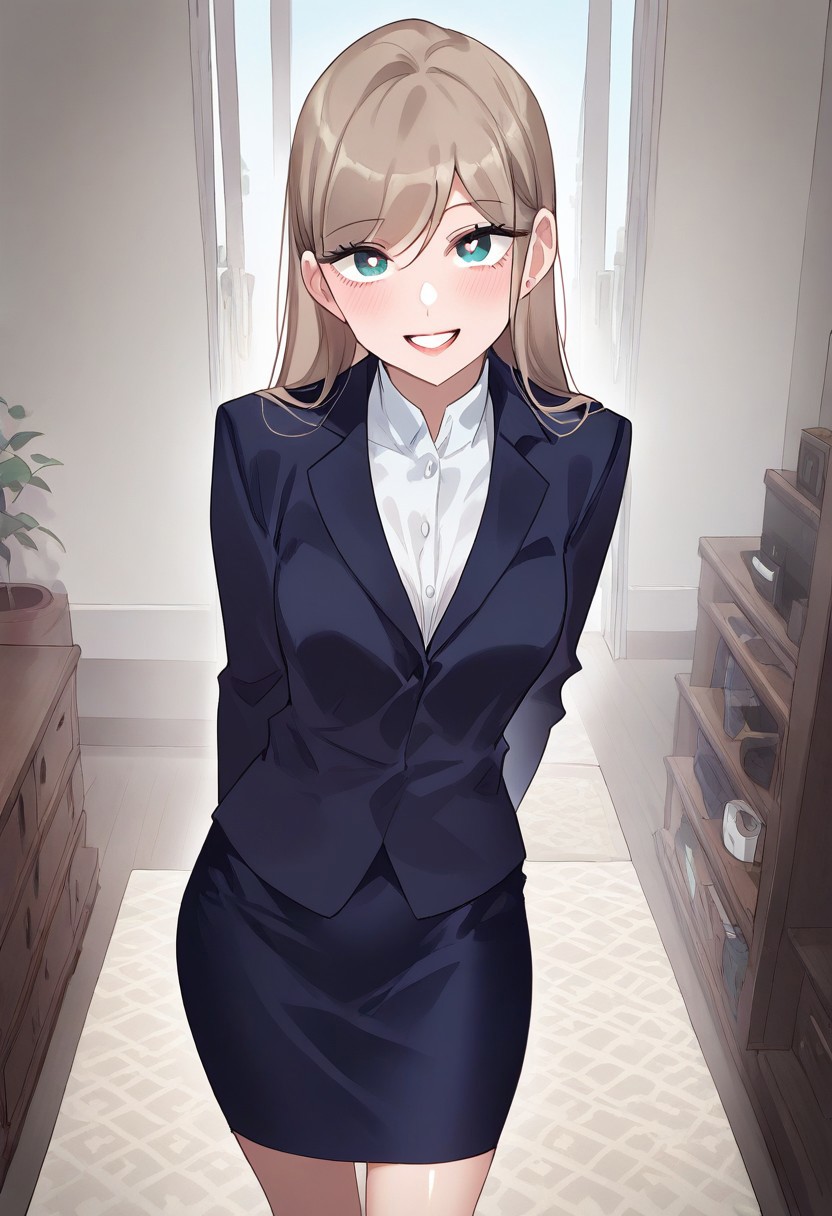 5a. ((正式,蓝色西装内搭高领白色衬衫,性感蓝色铅笔裙,)) + 带蓝色系绳的红色边缘工牌夹